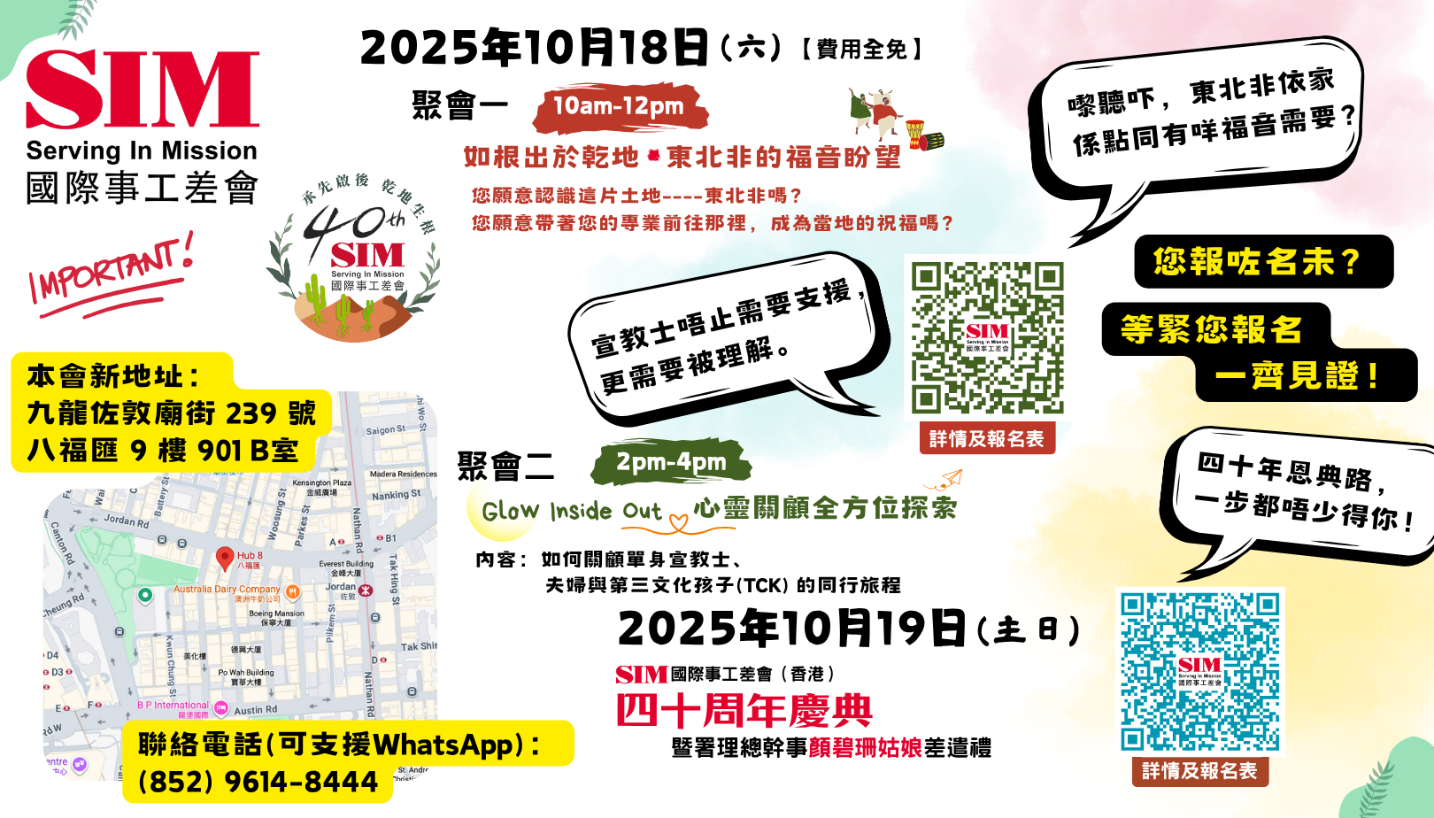 四十周年活動:SIM國際事工差會(香港)四十周年慶典暨署理總幹事顏碧珊姑娘差遣 網上登記