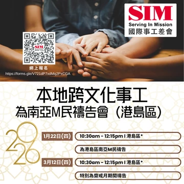 感謝您的禱告支持,如有任何查詢,歡迎來電 (852) 9614-8444 或 電郵 hongkong.admin@sim.org 聯絡我們
