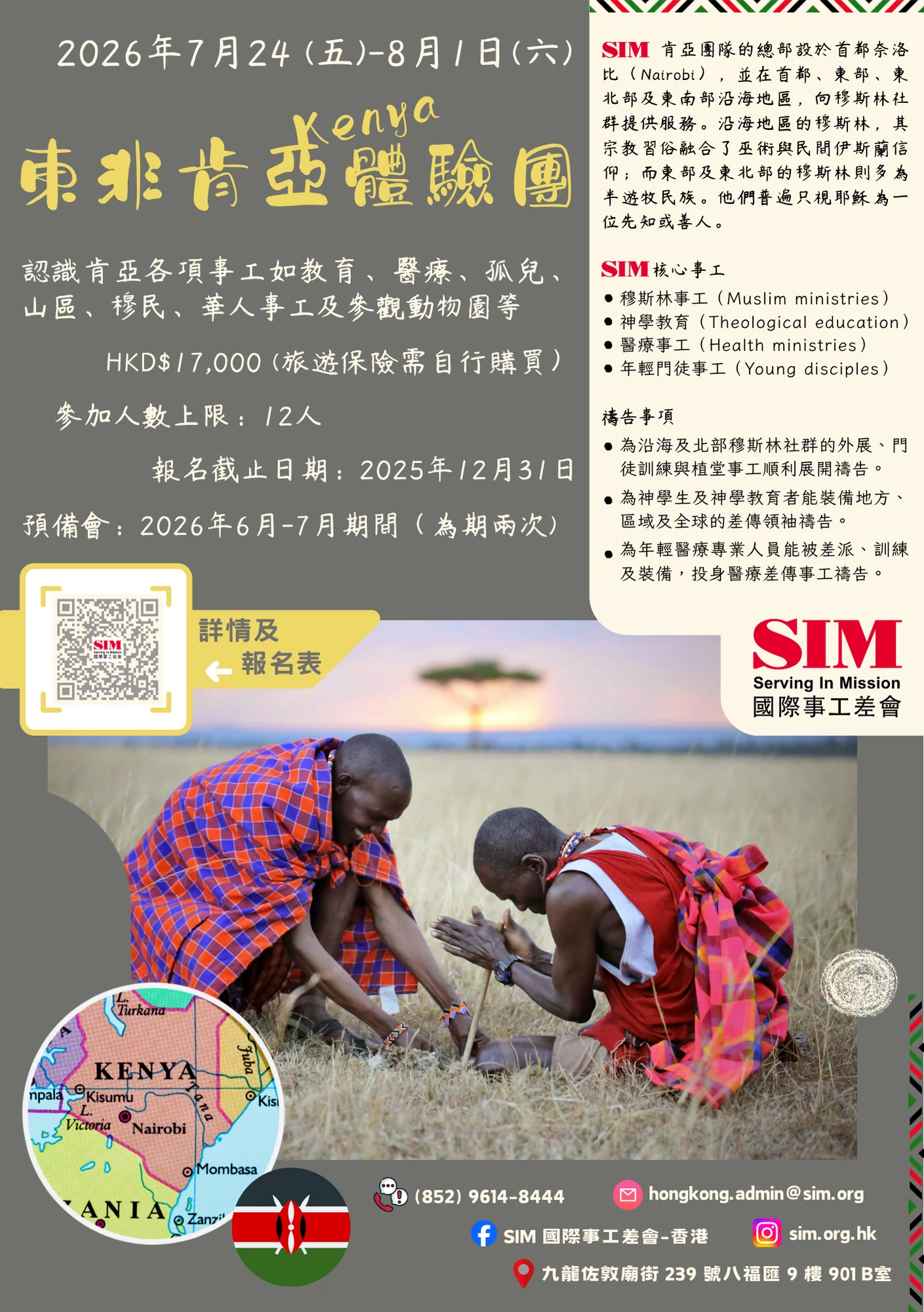 SIM肯亞團隊的總部設於首都奈洛比(Nairobi),並在首都、東部、東北部及東南部沿海地區,向穆斯林社群提供服務。沿海地區的穆斯林,其宗教習俗融合了巫術與民間伊斯蘭信仰;而東部及東北部的穆斯林則多為半遊牧民族。他們普遍只視耶穌為一位先知或善人。