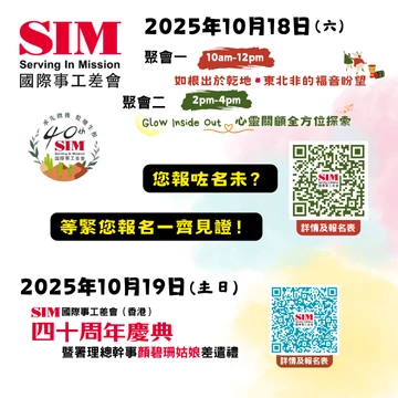四十周年活動:SIM國際事工差會(香港)四十周年慶典暨署理總幹事顏碧珊姑娘差遣 網上登記